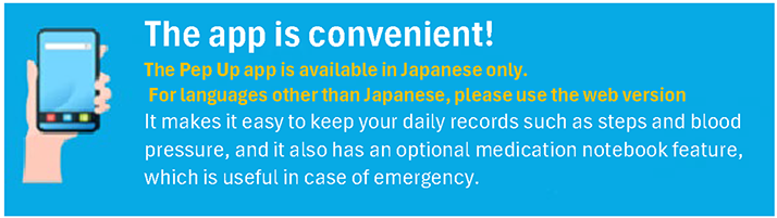 In addition, note that data posted on Pep Up (number of steps, etc.) and the registration status might be shared between the Health Insurance Society and business owners for the purpose of health promotion and other health-related activities.
