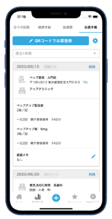 | By scanning QR codes, users can register data or link their data to other electronic medication notebooks. With the "Pep Up medication notebook," you can automatically import the prescription history of drugs you have received from every pharmacy, and this imported history is displayed in medication-notebook format. | You can receive health-related information, etc. based on your personal health condition. Please use this information for health maintenance and promotion. | Notices from the Health Insurance Society are delivered as push notifications. |