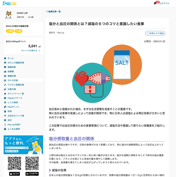 Pep Up is an app provided by JMDC Inc. that is intended to enable users to enjoy managing their health by using a smartphone, tablet, or PC. Users can accumulate Pep Points through health-related activities that include reading health-related articles and daily walking, which can then be exchanged for electronic money or various products.